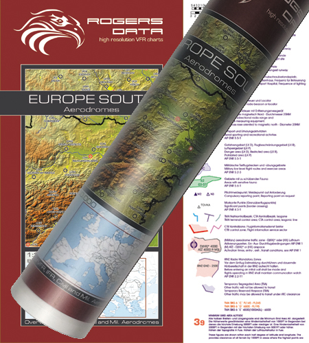 Die Wandkarte „Flugplätze Europas Süd Rogers Data 2.500k“ im Maßstab 1:2.500.000 enthält eine Übersicht über die europäischen Flugplätze, topografische Informationen, die politischen Grenzen und die Flächenausdehnung von Städten und Ortschaften. Die Flugplätze sind mit Namen und ICAO-Code vermerkt. Die verwendeten Symbole ermöglichen eine Unterscheidung zwischen VFR und IFR Flugplätzen, sowie eine Differenzierung zwischen zivilen und militärischen Flugplätzen.